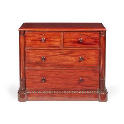 with two short over two long drawers flanked by lotus carved pilasters, on a bead moulded plinth base, the drawers stamped 'A. SOLOMON 59 GT QUEENS ST'
