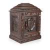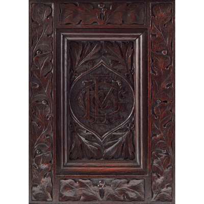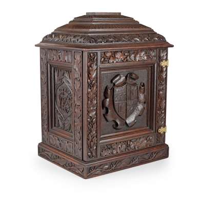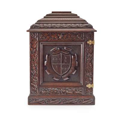 the moulded and carved stepped top above a single door centred with a carved armorial amongst borders of oak leaves and acorns in high relief, opening to four baize-lined drawers, the side panels carved with entwined monograms within similar borders, the lock plate stamped V/R/ EVERLOCK