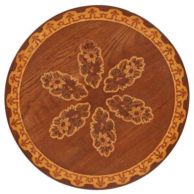 the circular top inlaid with Tunbridgeware floral panels within a ribbon inlay border, on a slender hexagonal support with corresponding inlay and ending in a tripod umbrella base