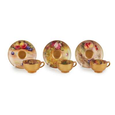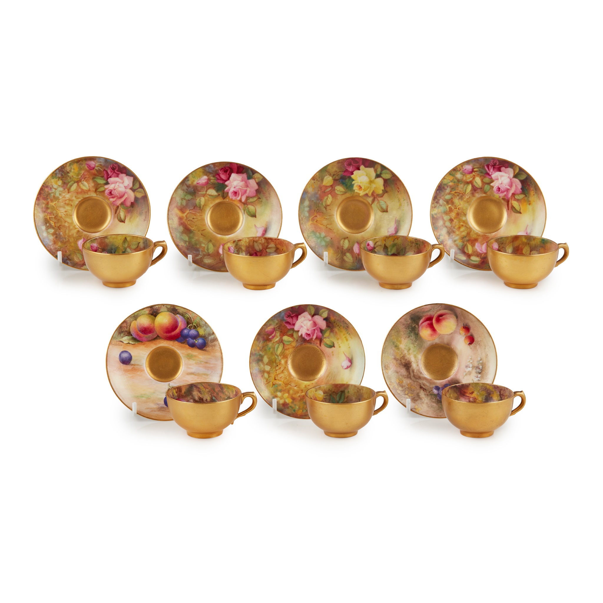 all cups with interior painted decoration and gilded exterior; comprising two fruit painted examples, the cups signed by Austin and Hale, the saucers signed by Ricketts and Rushton; and four rose painted examples, all signed by Twin; puce factory marks, various dates