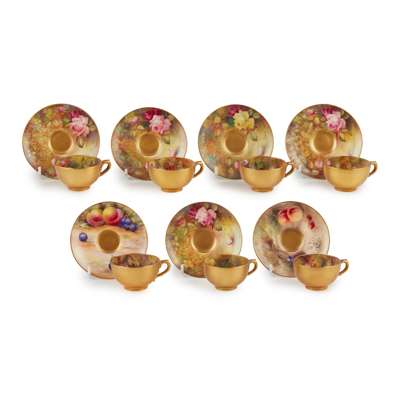 SEVEN ROYAL WORCESTER FRUIT PAINTED DEMI TASSE CUPS AND SAUCERS