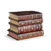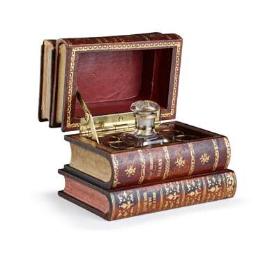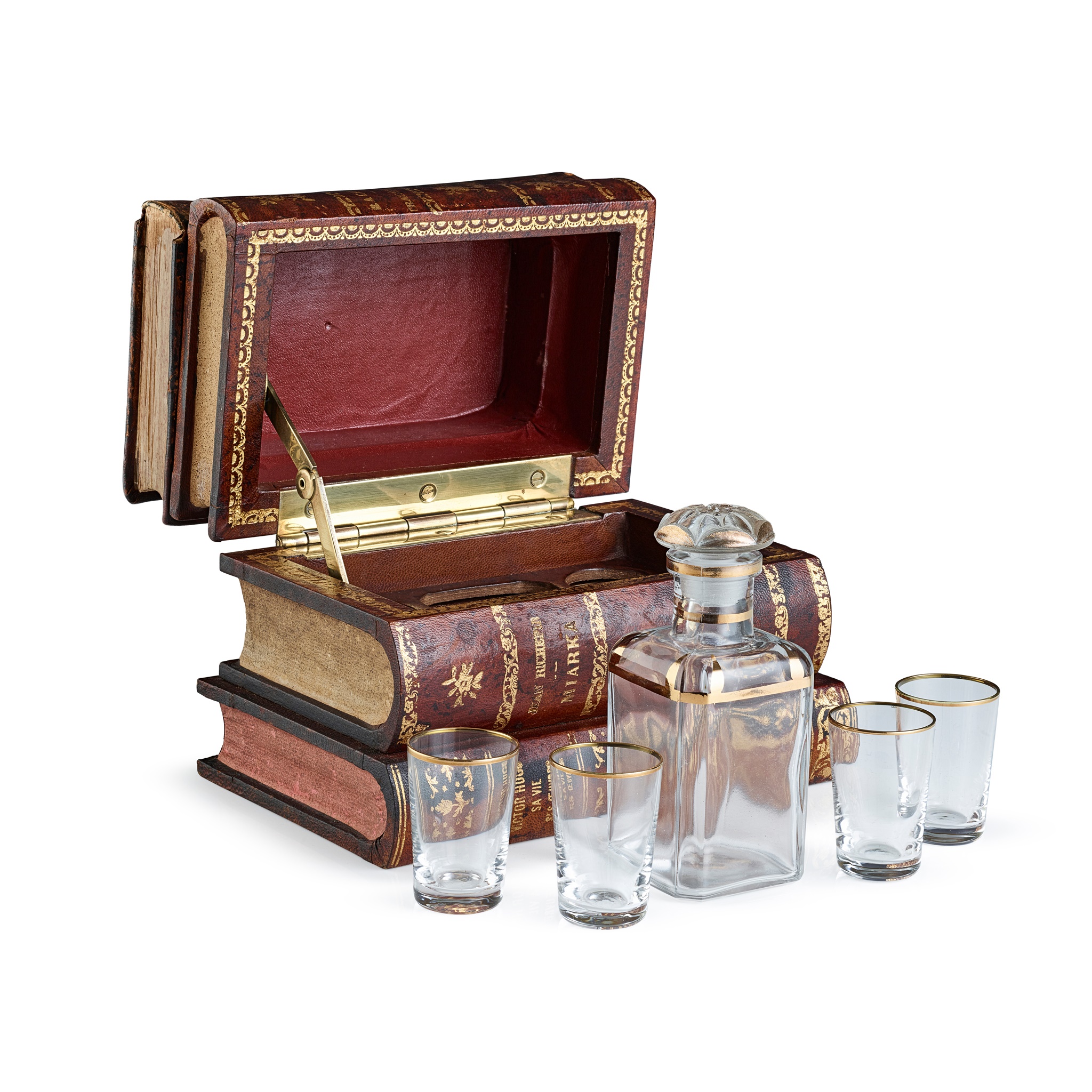 comprising one with four stacked leather bound books, hinged and opening to reveal a small gilt glass decanter and four glasses; and the other with two leather bound books, hinged and opening to reveal six glasses, 24cm wide, 8cm high, 17cm deep