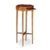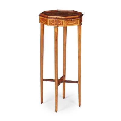the octagonal top with foliate and flower inlay within a gallery border, above a frieze with swag inlay and a cup slide, raised on square tapered legs joined by an X stretcher