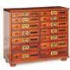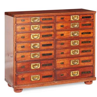 the case with two banks of seven drawers with recessed brass handles and numbered with labels for the contents, on bun feet