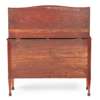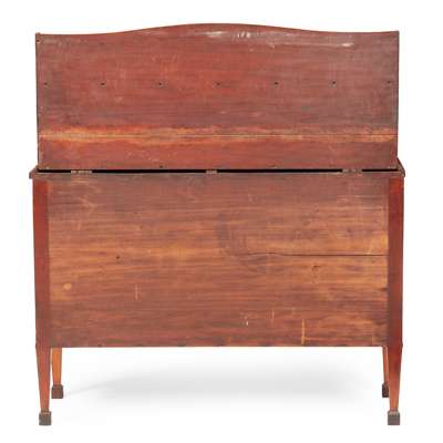 of serpentine outline, the superstructure with a shelf, the base with a pair of serpentine doors with circular reserves painted with scenes of courting couples, opening to shelves, decorated throughout with ribbon-tied flower garlands, swags, trophies, and husk trails, raised on square tapered legs ending in block feet