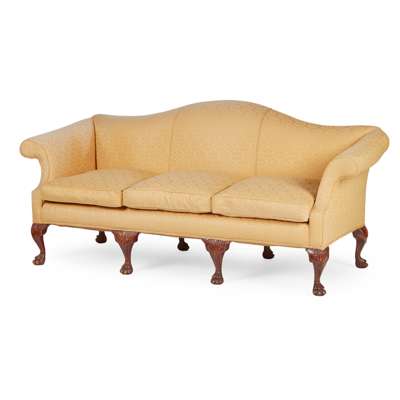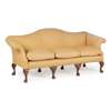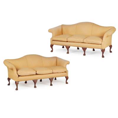 with hump backs and high scrolled arms above loose cushion seats, raised on eight shell-carved cabriole legs ending in paw feet; covered in yellow foliate patterned fabric