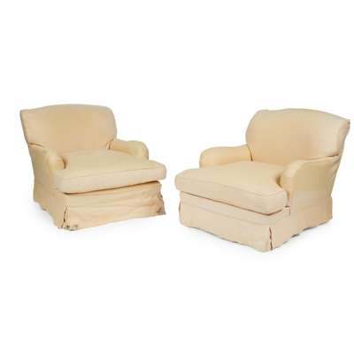 in the Howard & Sons style, with wide padded backs, scroll arms and deep cushion seats, on square legs with modern castors; with pale yellow slipcovers over houndstooth check upholstery, one black the other green