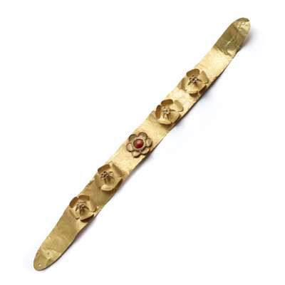 five gold rosettes mounted on a thin gold band, the central one mounted with a garnet