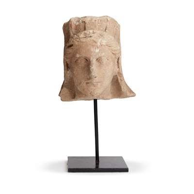 carved limestone, depicted wearing a mural crown with a himation drawn up over the back of the headdress, the hair parted at the centre and drawn across the forehead, soft featured, with large eyes, dainty nose and thin lips, raised on a bespoke mount