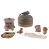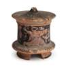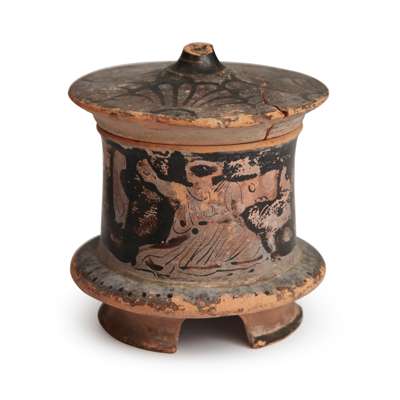 together with a red figure pyxis, a Roman oil lamp (broken), a head of a Tarentine lady of fashion, a terracotta fragment with the head of a goddess and an ancient Greek terracotta bird