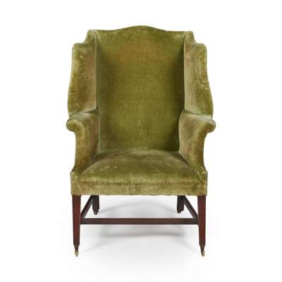 the back with a serpentine top rail above a stuffover seat flanked by deep wings and scrolled arms, raised on square tapered legs with brass caps and castors joined by an H stretcher, covered in green plush upholstery