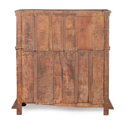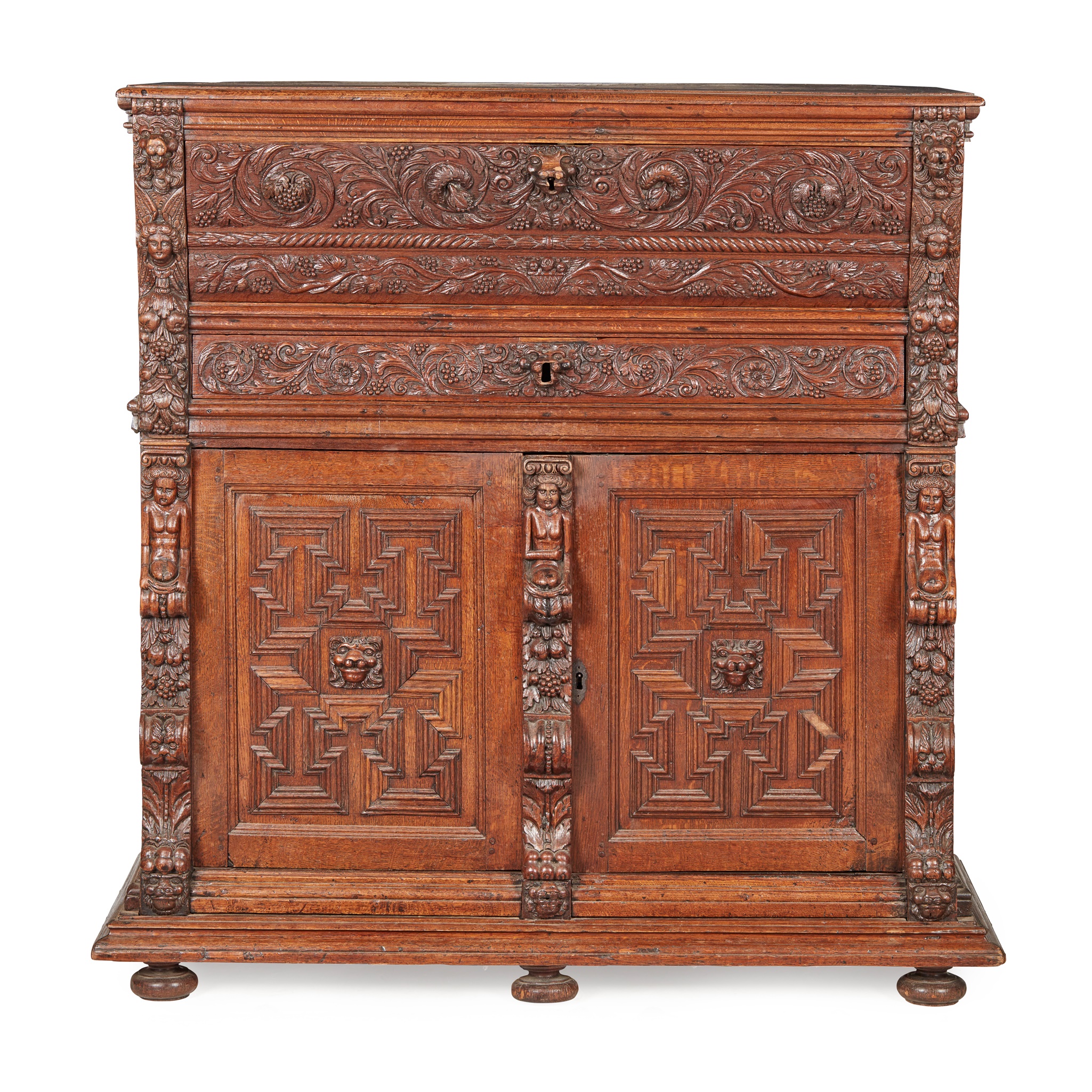 the upper section with a fall front panel and long drawer carved with fruiting vines and masks; over a base with a pair of moulded panel doors flanked and divided by carved figural pilasters, on bun feet