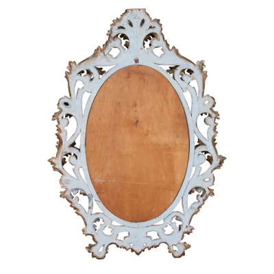 the oval bevelled mirror plate in a pierced frame carved with acanthus scrolls