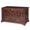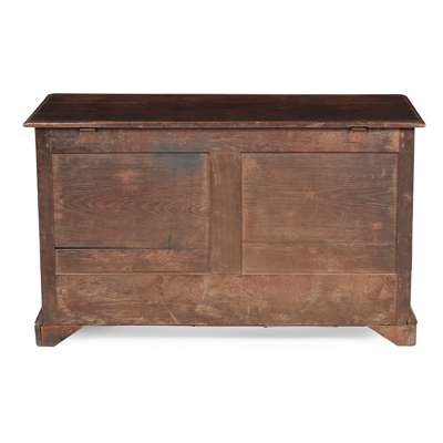 the hinged top above a fielded panel front with a pair of short drawers to the base, raised on bracket feet