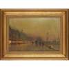 Greenock was painted a year before his untimely death from tuberculosis in 1893. Several of his children also became painters, including Louis Grimshaw, a son born in 1870. Louis trained under his father, and for a spell the pair painted collaboratively, with John executing the sky and landscape and Louis working on the figures. Like his father, Louis generally painted nocturnes, but he diverged by predominantly representing London. Louis’ career as an artist was relatively brief, as he gave up painting in 1905 to work as a cartographer for the Manchester Guardian, and his paintings are consequently rare.