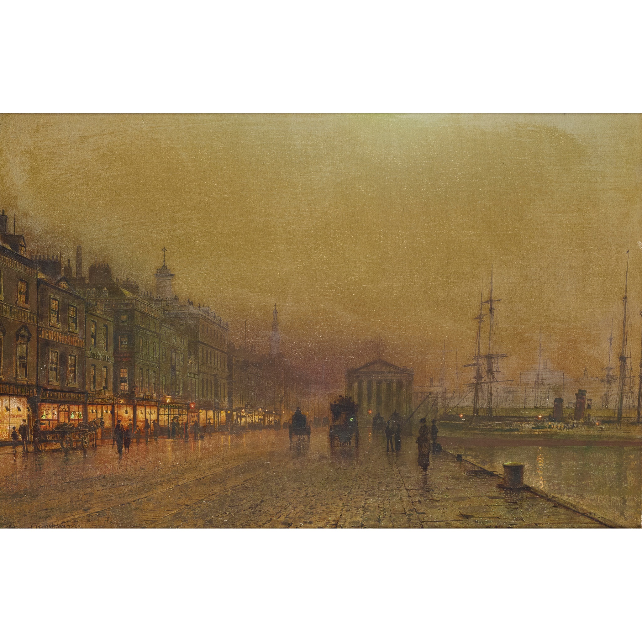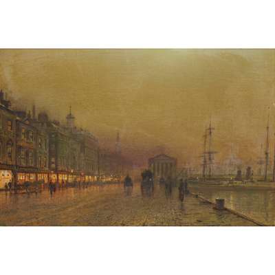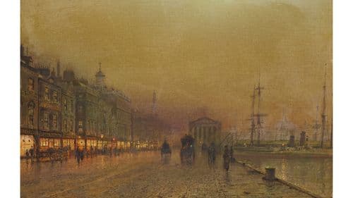 This Greenock scene exemplifies Atkinson Grimshaw’s mastery of ephemeral light. Greenock is situated on the River Clyde around 22 miles from Glasgow, and in the 18th and 19th centuries was a thriving and populous shipbuilding hub. Atkinson Grimshaw delineates the architecture with sharp precision, which serves as a visual counterpoint to the soft, delicate palette. While muted tones evoke the damp evening haze, points of tonal intensity draw the eye to the bustle of activity across the quayside, from the moored ships’ blinking lights, to the carriages conveying silhouetted figures, to the warm glow emanating from the row of smart shops.
