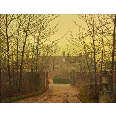 By 1870 he was successful enough to rent Knostrop Hall, a seventeenth-century mansion represented in Evening in Knostrop. The Hall was built for Adam Baynes (1622-1671), the first Member of Parliament for Leeds, and its Jacobean architecture would prove an enduring inspiration which Atkinson Grimshaw would continue to paint for the rest of his life. Evening in Knostrop depicts a solitary, fashionably-dressed figure waiting at the gate to the house. The shadowy landscape under the pale sky successfully evokes the ambience of Knostrop’s grounds in twilight.