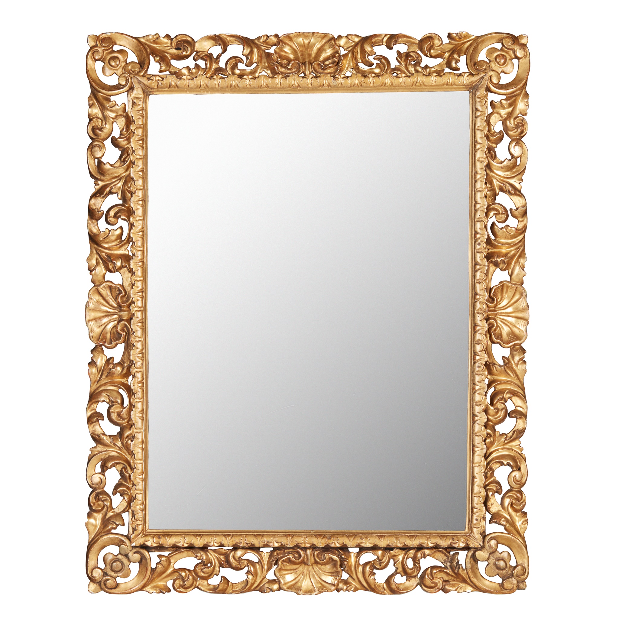 the rectangular mirror plate in a pierced frame carved with acanthus scrolls and shells