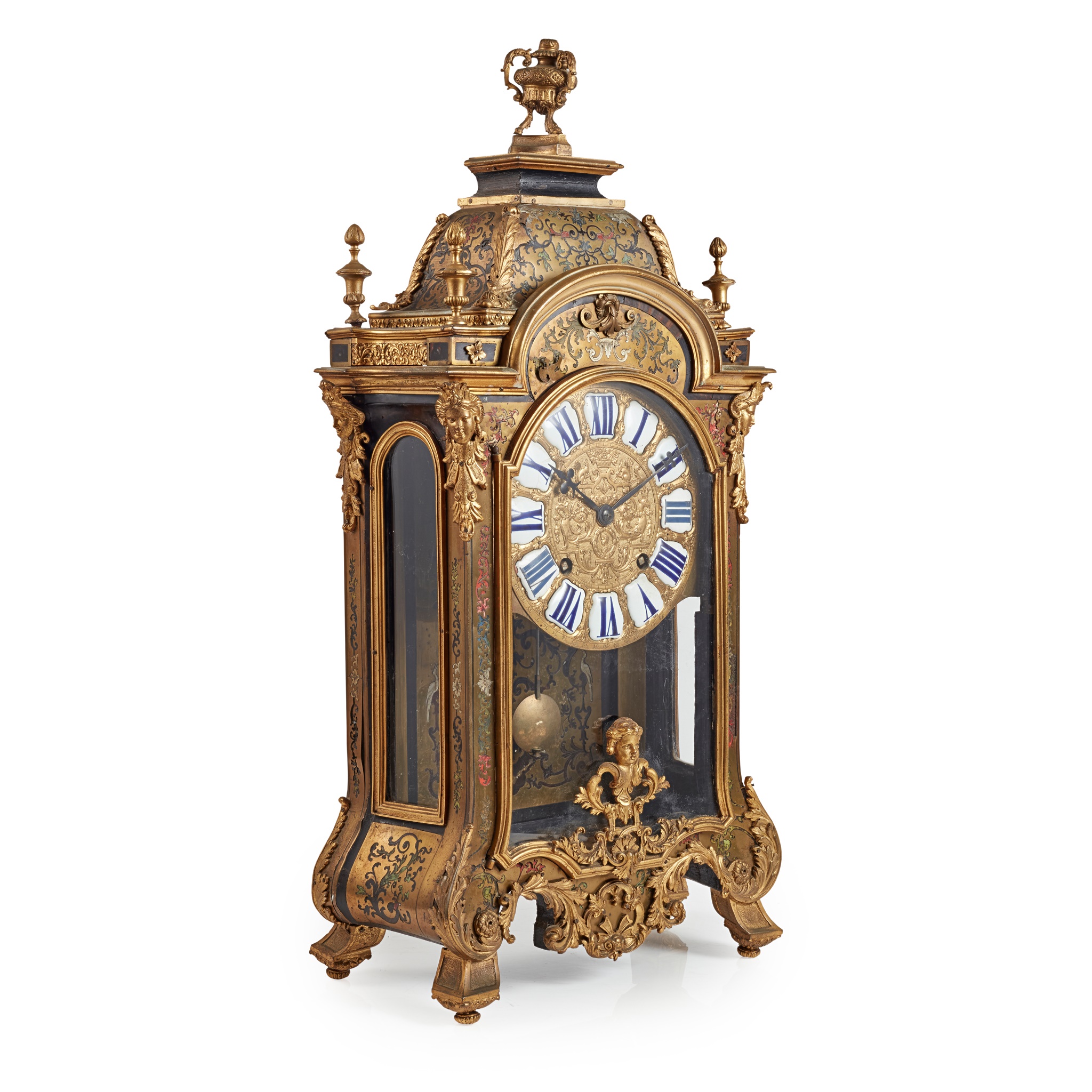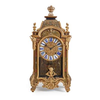 the gilt embossed dial with white enamel cartouche Roman numerals, in a brass and red tortoiseshell case mounted with gilt bronze masks, acanthus scrolls, and surmounted by a censer, the movement signed 'Jacques Cogniet a Paris'