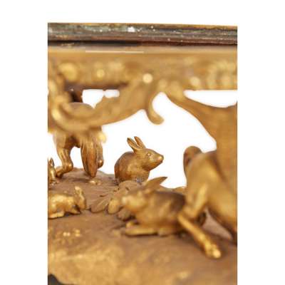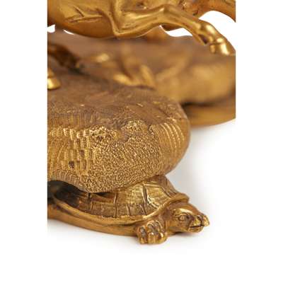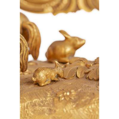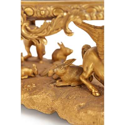 the oval body painted to either side with a reserve depicting a courting couple enjoying music, within a gilt border enclosed within rocaille scrolls, on a bleu céleste ground; with a gilt metal liner and a gilt metal mount of fruiting vines, the twin handles modelled as male and female bacchanalian figures, raised on a stand modelled as four winged horses on a naturalistic foliate ground with rabbits and bunnies, raised on four tortoise feet; gilt painted interlaced LL mark