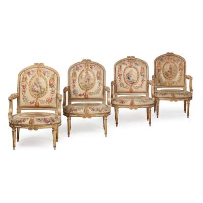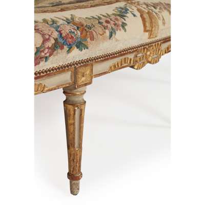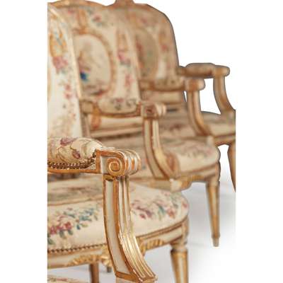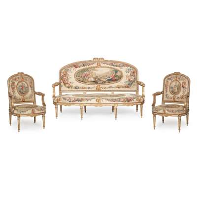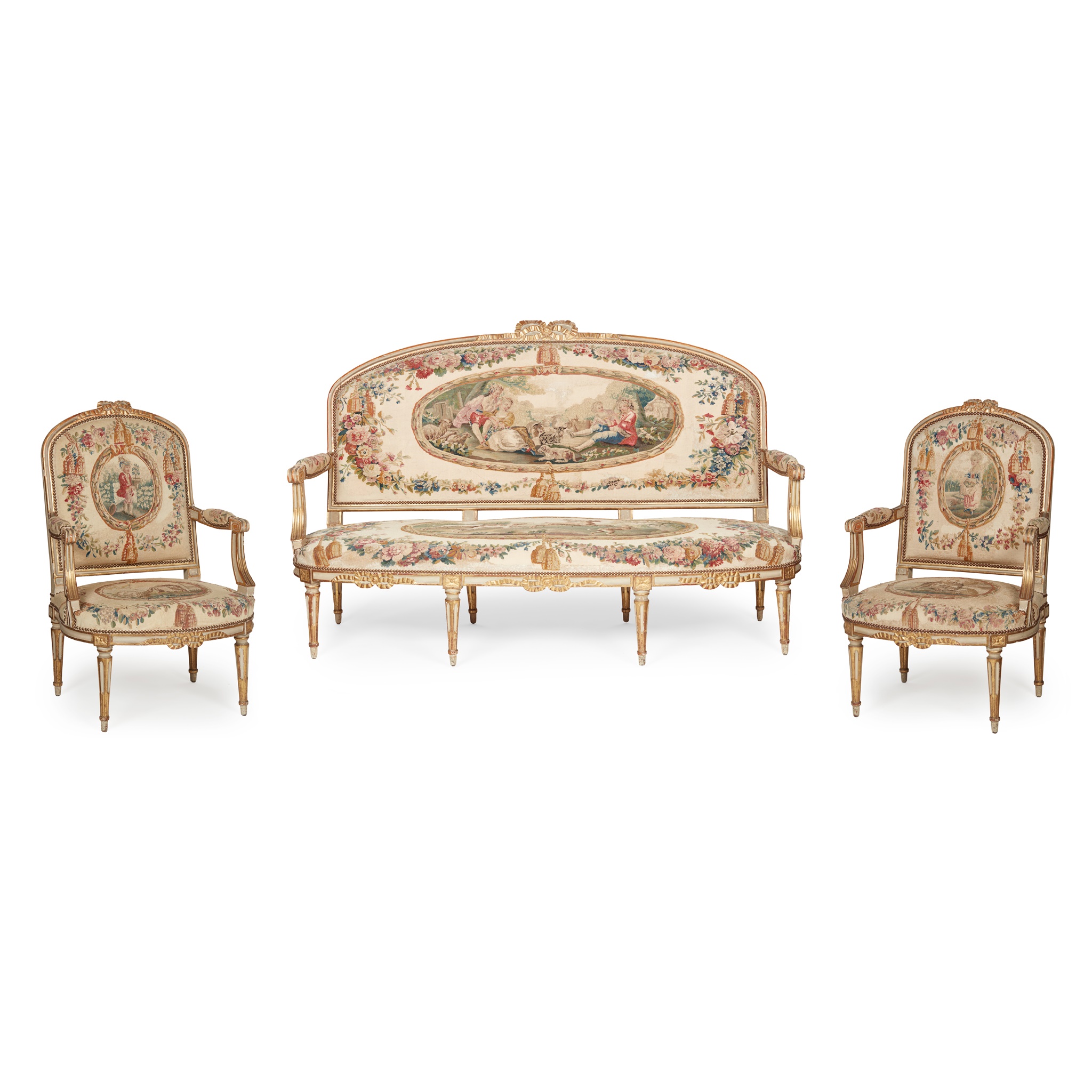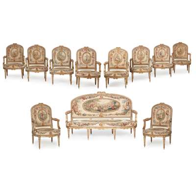 FINE ELEVEN-PIECE SUITE OF LOUIS XVI PAINTED AND PARCEL-GILT AUBUSSON COVERED SEAT FURNITURE