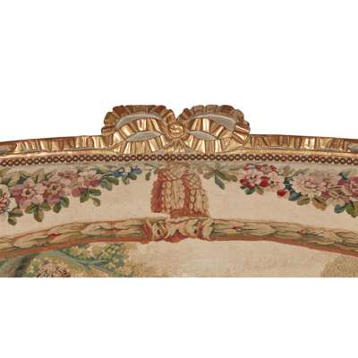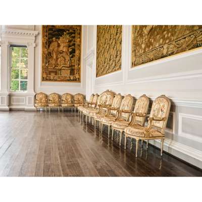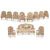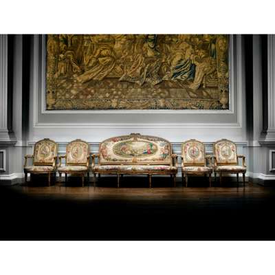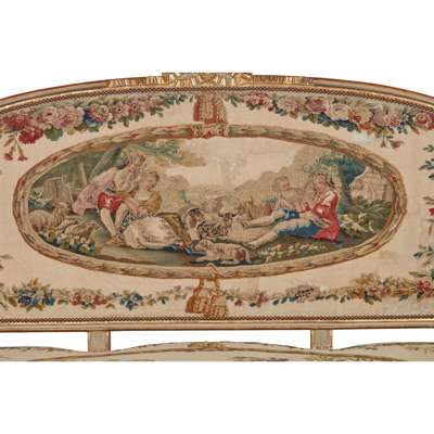 comprising a canape and ten fauteuils, with arched backs with carved ribbon cresting, above bow-front seats flanked by part-padded arms with stop-fluted supports, raised on tapered stop-fluted legs ending in toupie feet, one armchair inscribed '66' or 'GG'; covered in Aubusson tapestry with floral garland borders enclosing laurel-wreath medallions depicting children, animals, and scenes from Jean de la Fontaine's Fables