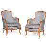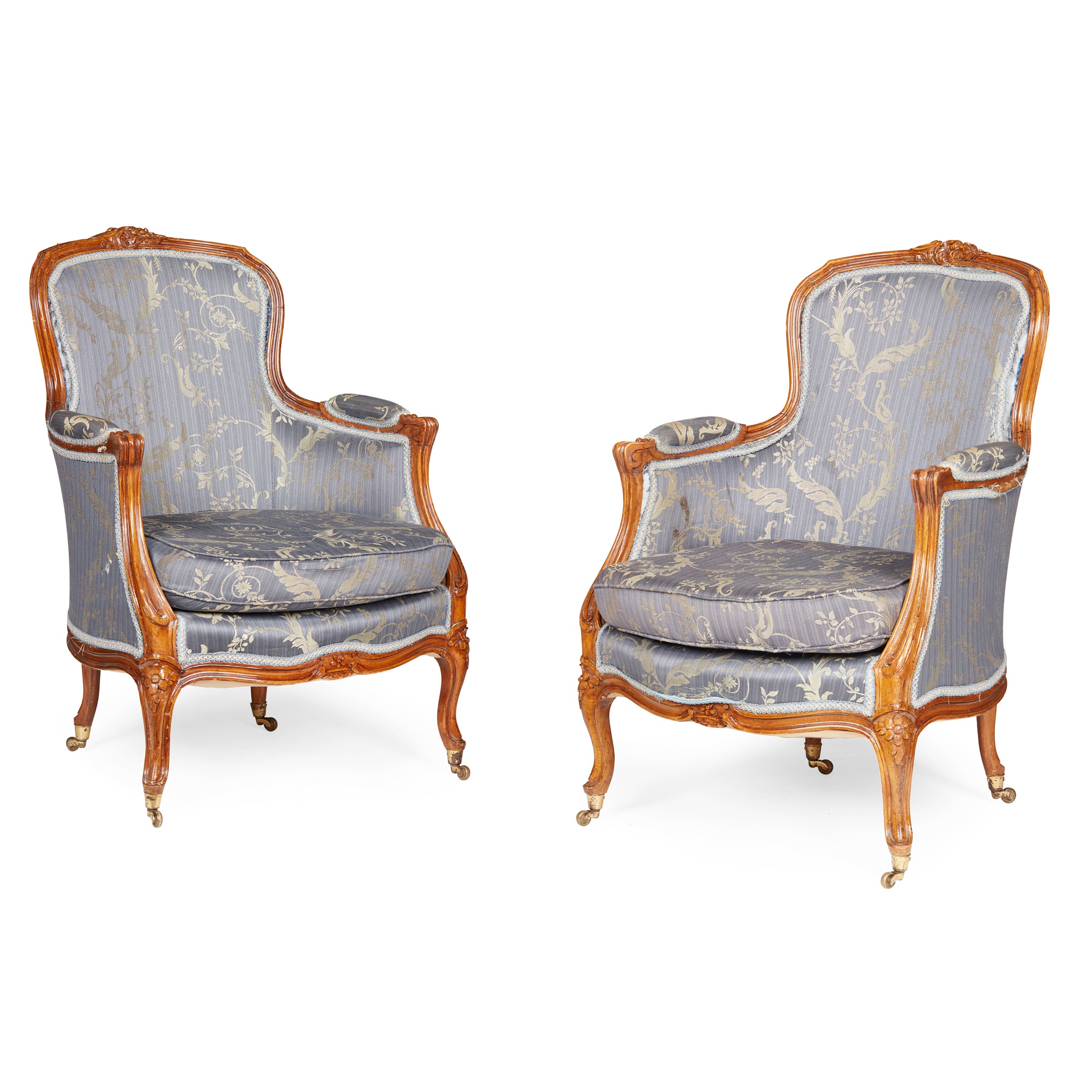 the shaped backs with moulded frames carved with flowers above cushion seats flanked by part-padded enclosed arms, raised on flower-carved cabriole legs ending in brass caps and castors