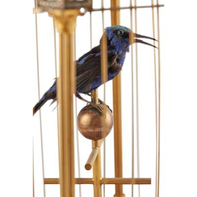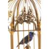 the bird pivoting on its perch with movement to the beak, head, and tail, the domed cage mounted with lovebirds and flower sprays, on an octagonal base set with Sèvres style porcelain plaques alternately painted with birds and Cupid, stamped on the base BONTEMS/ PARIS