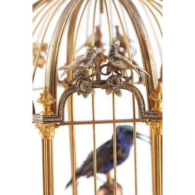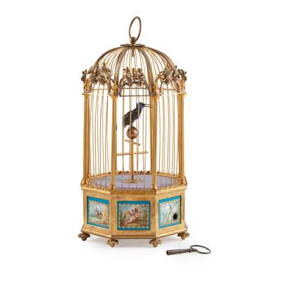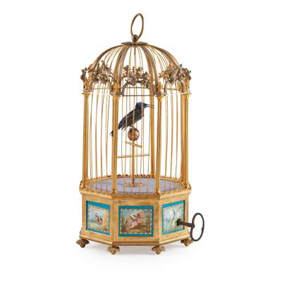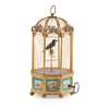 FRENCH PORCELAIN MOUNTED GILT AND SILVERED BRASS BIRDCAGE AND SINGING BIRD AUTOMATON, BONTEMS, PARIS