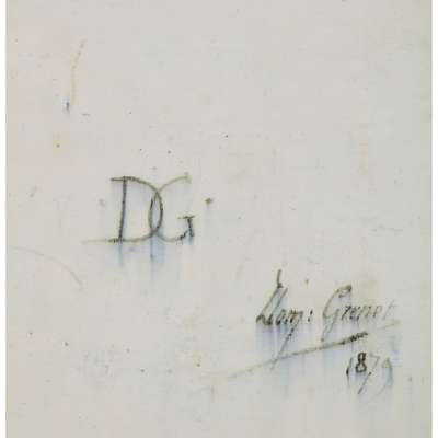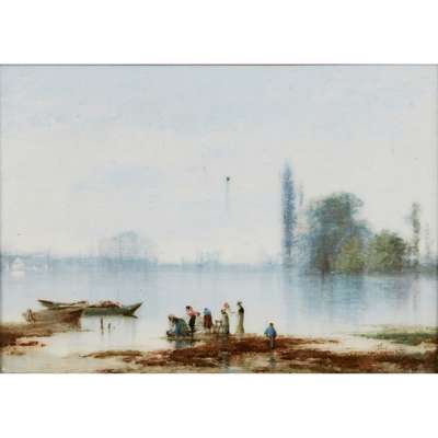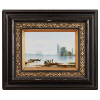 depicting figures and boats by a river, painted marks verso DG, Dom. Grenet 1879, in a heavy ebonised frame with decorative gilt border
