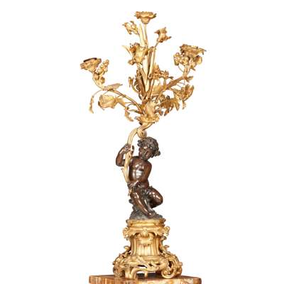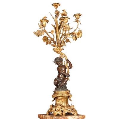 the candelabra in the manner of Clodion, with seated putto supporting flower-form candle branches, on rococo bases; the pedestals in brown onyx with laurel cast gilt metal mounts