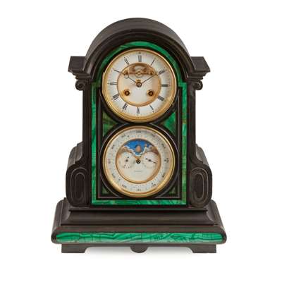 FRENCH SLATE AND MALACHITE MANTEL CLOCK WITH PERPETUAL CALENDAR DIAL