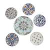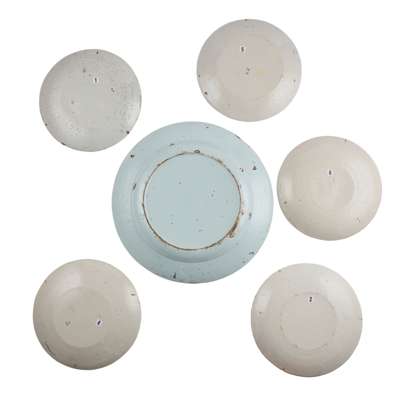 comprising an 'Ann Gomm' type charger, in manganese with radiating lines centred by a flower; a pair of plates with a red flower enclosed within flower and feather panels, painted 13 and 23 to the reverse, 22.8cm diam; a plate with panels of blue flowers and red diaper ground, 22cm diam; a plate with iron red flowers and stylised leaves, the rim with blue scrolls and red fruit, 22.5cm diam; and a plate with a leaf motifs, surrounded with sprigs of red and yellow flowers, within a blue line rim, 23cm diam.