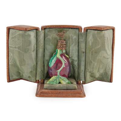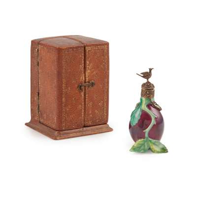 with gilt brass bird form finial and collar above the plum-form body, impressed 35/ S, in a leather-clad case