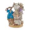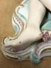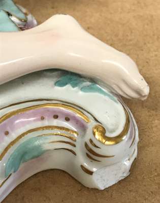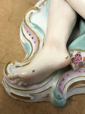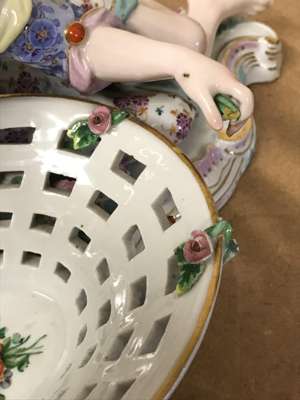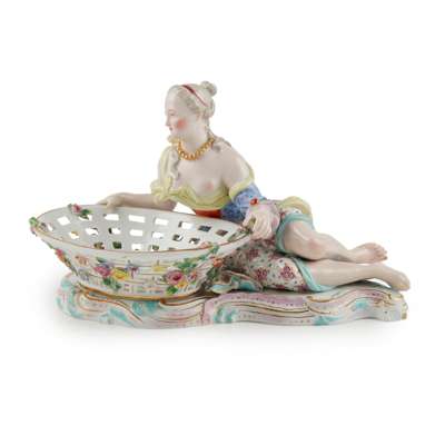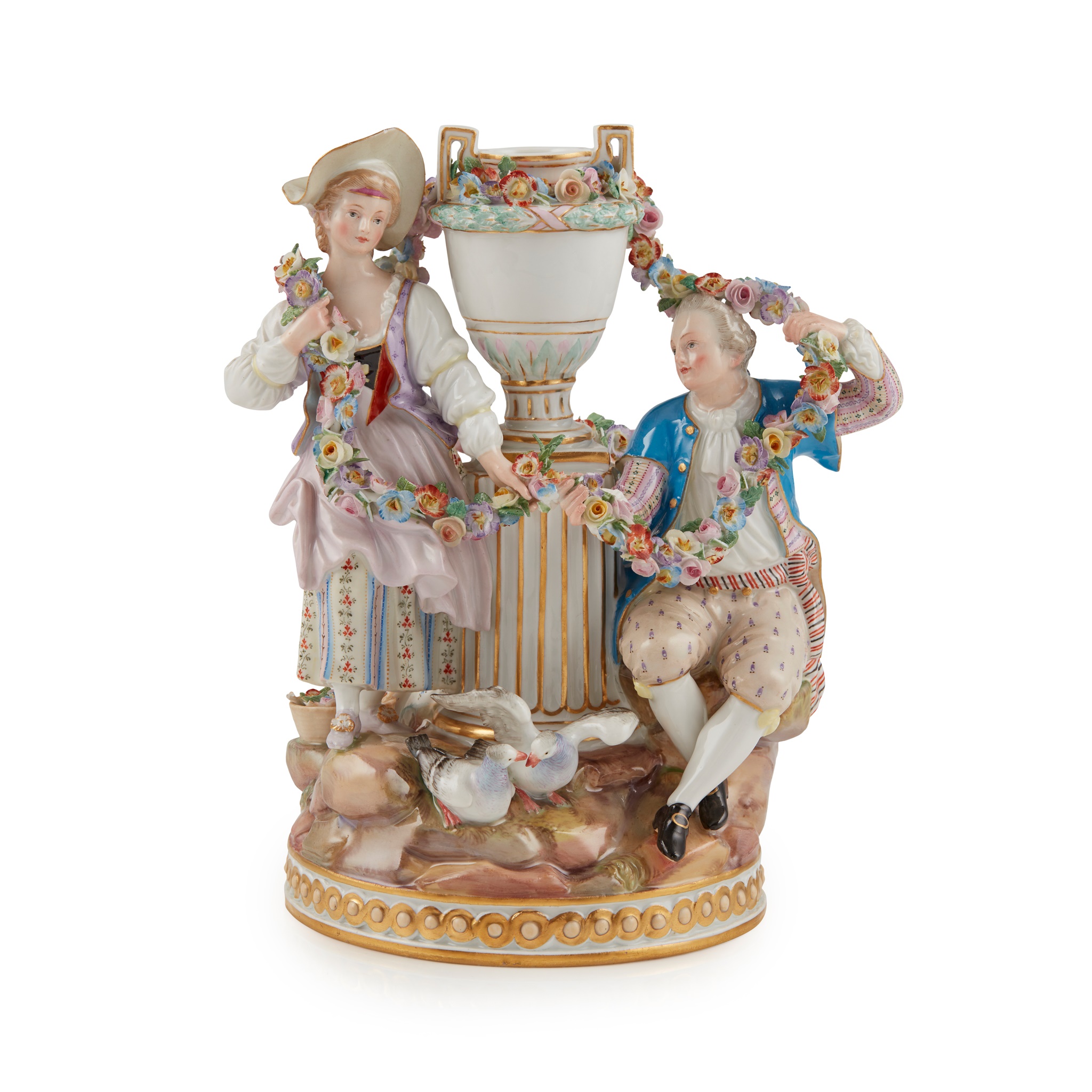 modelled with a fluted column and urn flanked by a pair of courting lovers holding a flower garland, to the reverse a girl with a flower garland, on a naturalistic rocky ground and a circular base; underglaze blue crossed swords, F.88; together with a MEISSEN SWEET MEAT BASKET, modelled as a lady lying alongside a pierced basket with applied flowers, blue crossed swords, incised 2858, 16.5cm high, 30cm wide