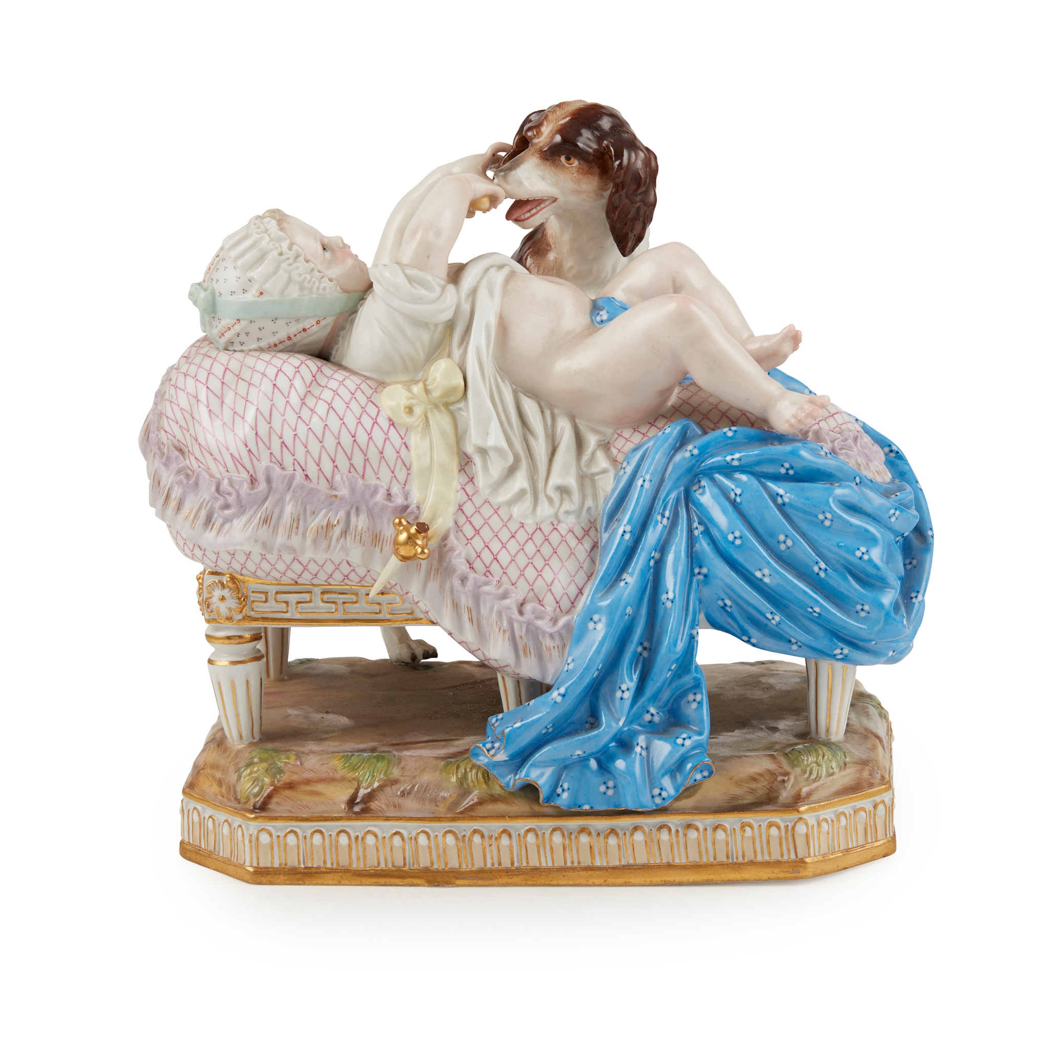 after the model by Acier, modelled as a baby lying on a stool, a dog leaping up to lick her fingers, on a naturalistic rectangular base with moulded gilt rim and canted corners; underglaze blue crossed swords, incised E.77