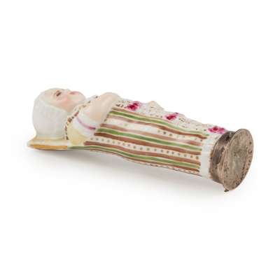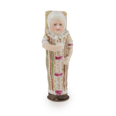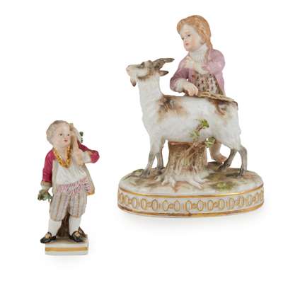 comprising a figure of a boy wearing a pink coat, standing beside a goat, on an oval base with gilded rim; incised H.82; and a smaller figure of a boy wearing a red coat and carrying some grapes in a handkerchief tied to a stick carried on his shoulder, incised G.7; both with under glaze blue crossed swords; together with a CONTINENTAL PORCELAIN BODKIN CASE/ NEEDLE HOLDER, modelled as a swaddled baby with a white metal mount and hinged cover, unmarked, 8.5cm long