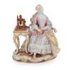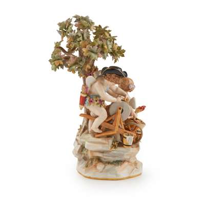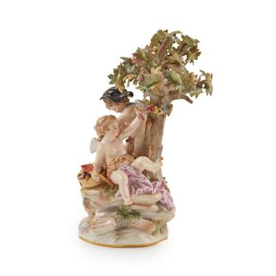 comprising a lady seated in an armchair beside a table with a spinning wheel, the base moulded with gilt edged rocaille scrolls, underglaze blue crossed swords, incised 2685; the other with amorini sharpening arrows, on a rocky ground and a gilt rimmed base; underglaze blue crossed swords and dot, incised E26