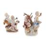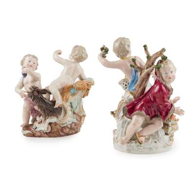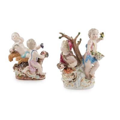 the first with two putti representing Winter, who warms his hands over a fire, and Spring, who carries a pierced basket of flowers and holds a posy in each hand, on a naturalistic rocky base with moulded gilt edged rocaille scrolls; blue crossed swords; incised 1239; the other with two putti representing Autumn, who carries a scythe, and Summer, who carries a bunch of grapes; on a naturalistic rocky base with moulded gilt edged rocaille scrolls; underglaze blue crossed swords, incised 1230