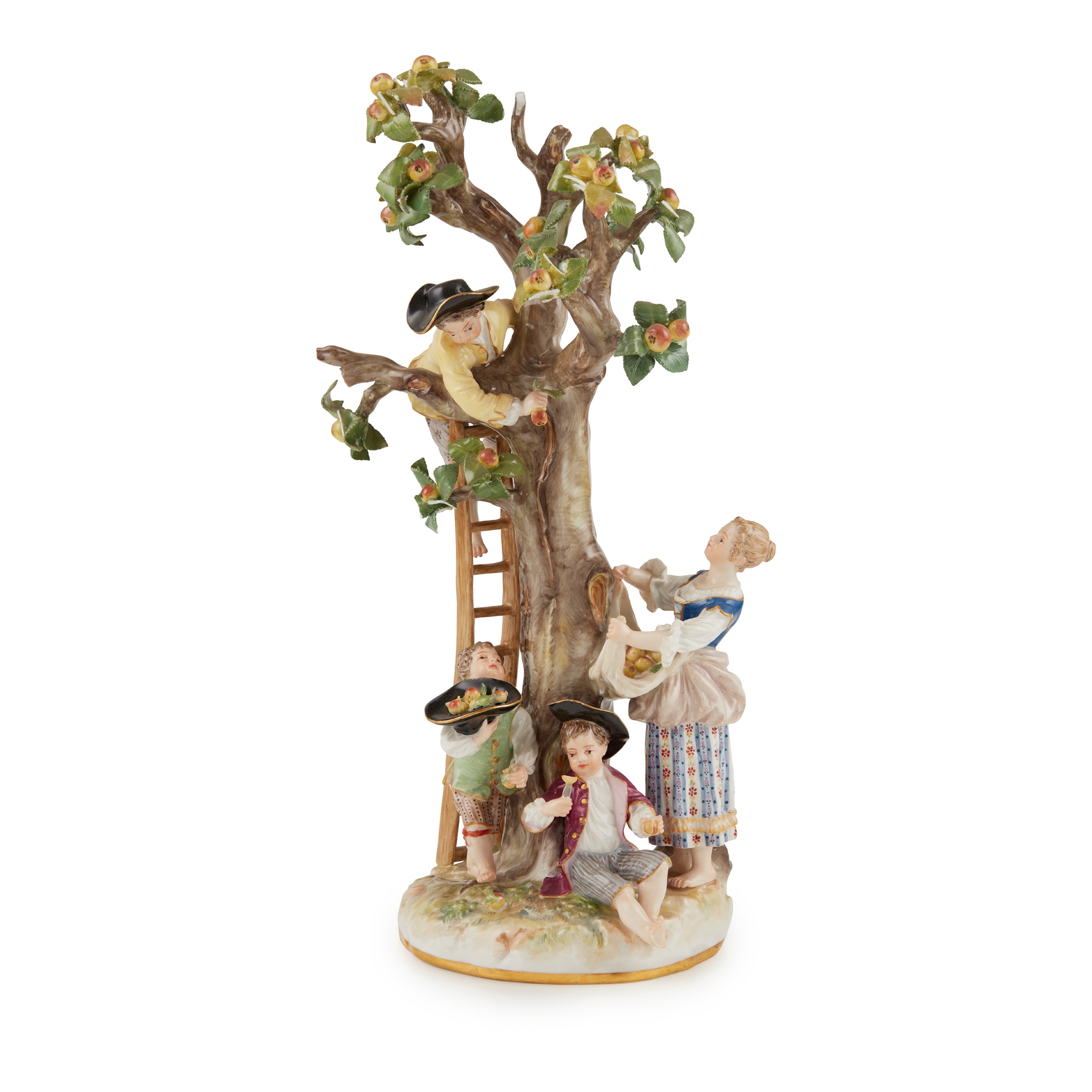 after the model by J.J. Kaendler, modelled as a boy on a ladder picking apples, with a lady below gathering them in her apron and a boy gathering them in his hat, with a further boy slicing and eating an apple; on a naturalistic gilt-edged base; underglaze blue crossed swords, incised 1998