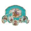 comprising two cups and saucers, a sugar basin and cover, a coffee pot and cover, a cream jug and a shaped tray; outside decorated, each piece painted with panels depicting scenes of courtship within gilt scroll borders, on a blue turquoise ground with gilt decorated borders and rims; blue crossed swords with incised lines