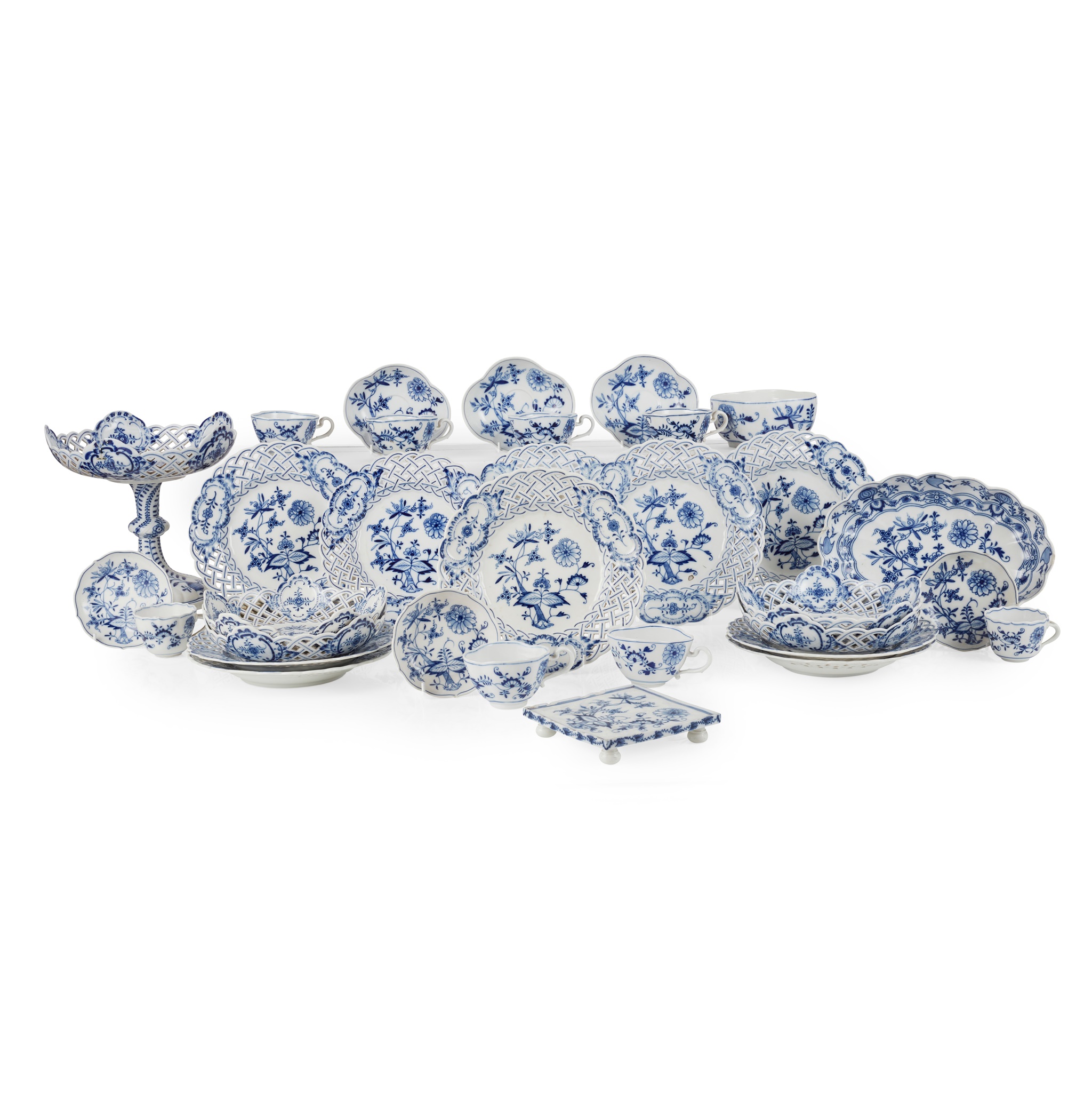 comprising ten plates, 21.2cm diam; five pierced shallow bowls, 28.5cm diam; a tall comport and a knopped stem, 22cm high, 22.2cm diam; together with a MEISSEN BLUE AND WHITE 'ONION PATTERN' PART TEA SET, comprising six quadrilobed cups; three quadrilobed saucers; two small coffee cups with barbed rims; three small saucers with barbed rims, 10.5cm diam; a quadrilobed sugar basin; a fluted oval dish, 25.7cm wide; and a square stand on bun feet, 12.5cm x 12.5cm; underglaze blue crossed swords, impressed numbers, some painted numbers
