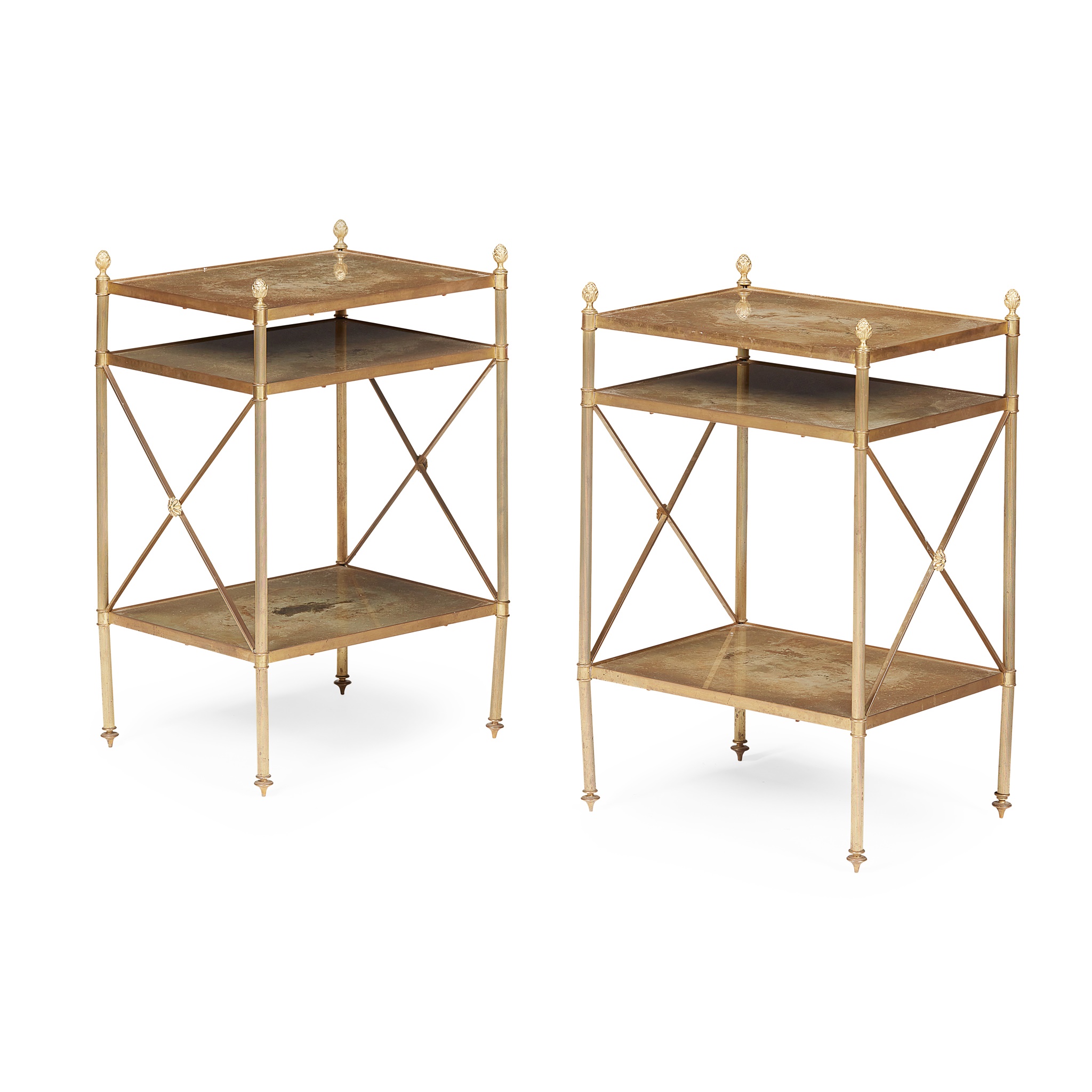 PAIR OF GILT METAL AND GLASS THREE TIER OCCASIONAL TABLES, ATTRIBUTED TO MAISON BAGUES