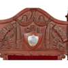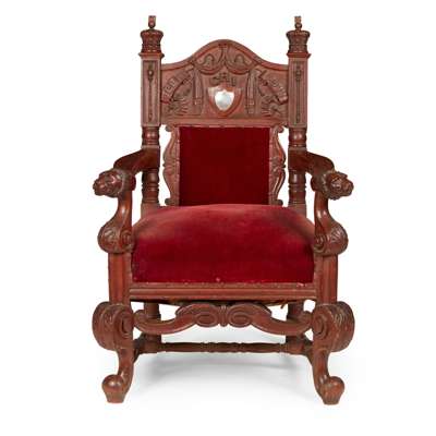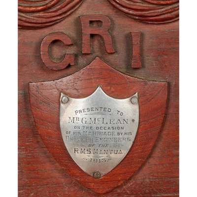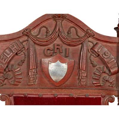 the arched back panel carved with ribbons and swags inscribed 'DELHI 1911' and 'GRI', with a silver mounted presentation plaque inscribed 'PRESENTED TO MR G MCLEAN ON THE OCCASION OF HIS MARRIAGE BY HIS BROTHER ENGINEERS OF THE R.M.S. MANTUA 1913', and surmounted by carved crown finials, above a wide padded seat flanked by open arms ending in carved lion head terminals, raised on acanthus carved scroll legs joined by a turned H stretcher