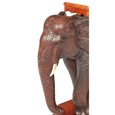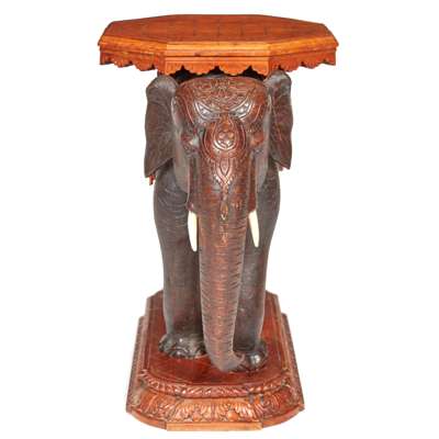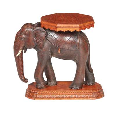 the octagonal seat with a scalloped apron resting on the back of an elephant mounted with ivory tusks, on an oblong base carved with gadrooning and leaf tips, inscribed 'Prepared by Ganpatram Jatram Mibtry and Sons Pirametar Road, Bazar Baroda'