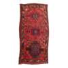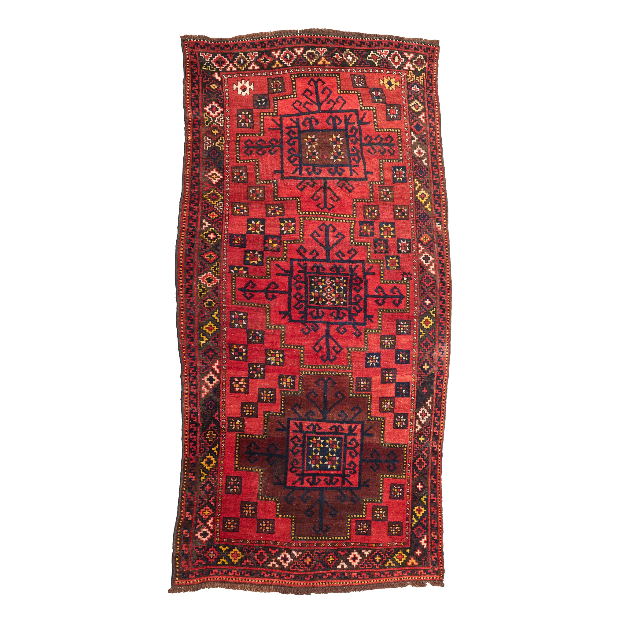 the red field with three indigo lattice rectangular medallions, within brown border