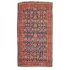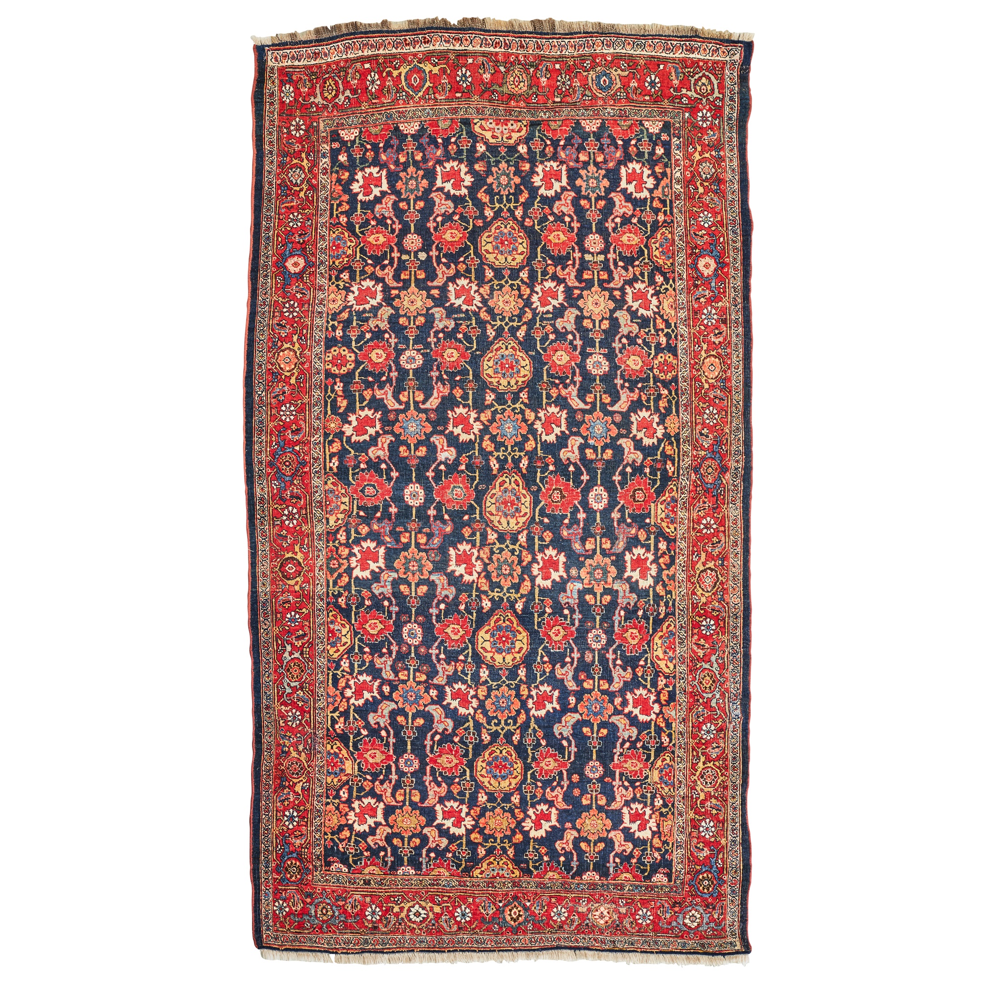 the indigo field with allover palmette and vine lattice pattern, within red border