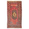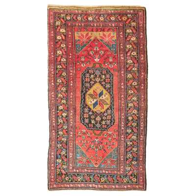 the red field with elongated brown and olive-green medallion, green spandrels, within brown border