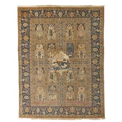 the field with allover mihrab lattice pattern, with pictoral medallion, within indigo border