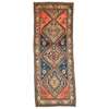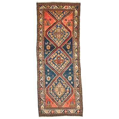 the indigo and red field with three and a half polychrome lozenge medallions, within indigo and cream border